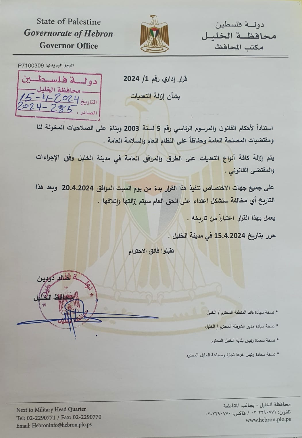 قرار اداري صادر عن محافظ الخليل بشان ازالة التعديات على الطرق والمرافق العامة